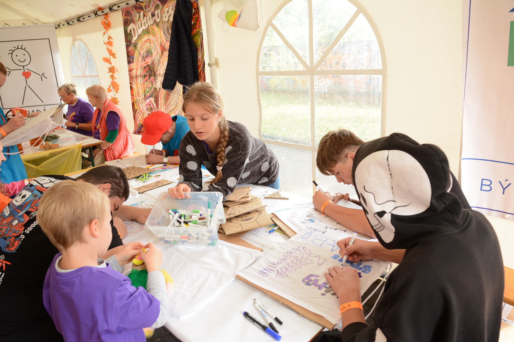 Nedeľné ráno bolo rušné, množstvo dobrovoľníkov pripravuje celý priestor nielen pre hudobníkov, ale aj pre workshopy. Veď pre deti musí byť vytvorená aj tvorivá zóna. Maľovanie tašiek, šiltoviek, na gaštany, výroba dekorácií, tekvičiek z textilu, pletenie s prútím, enkaustika, maľovanie na tvár. To všetko si deti mohli vyskúšať. Väčšiu časť tvorivých ponúk zastrešovali lektori zo Starej Turej – Soňka Kotrasová, Mirka Lacová, Ivetka Ištoňová, Lucka Loss, Margarétka Beľanová, Andrejka Šimončičová, Julka Lisá, Oliver Psotný a rodina Peťa Beňu. Tí vytvorili krásne prostredie so zaujímavou ponukou pletenia s prútím. Značnú časť materiálu na tvorenie sme získali vďaka podpore Nadácie ŽIVOT. Úprimná vďaka za podporu!