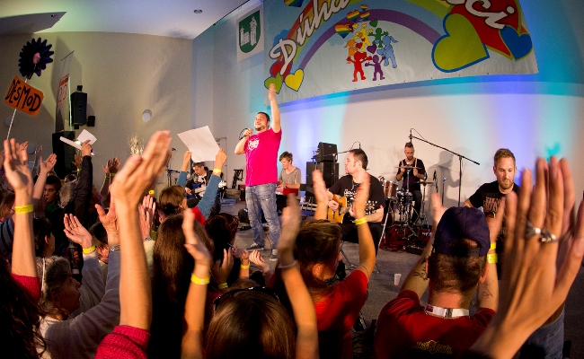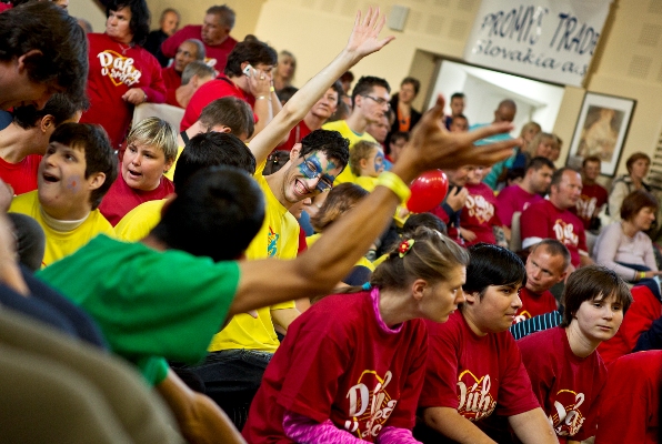 Hudobný benefičný program rozprúdil úžasný zumba tanečník JAVIER CALDERON MORALES z ďalekej Kostariky. Svojim temperamentom zaplnil sálu a ponúkol nekonečné množstvo nových tanečných kreácií, ktoré sa všetci mohli spoločne naučiť. Mladá nádejná kapela MEDIAL BANANA svojim reggae štýlom a tancom naladených účastníkov koncertu nenechala sedieť na stoličkách. Mierny oddych pre telo, ale pastvu pre oči poskytla tanečná skupina LATINO FLASH MIQUÉLA MENDÉZA z exotickej Nikaraguy. Po nádherných rytmických pohyboch tanečníkov predviedol svoje básnické umenie Juraj Kohútik z Centra sociálnych služieb v Novom Meste nad Váhom, ktorý svojim umením všetkých milo prekvapil. Jazzové pesničky PETRA LIPU dokonale spestrili paletu hudobného programu. Známu pieseň „Štyri kone vrané“ si všetci spoločne zaspievali a deti povzbudzovali džezmena vlastnoručne vyrobenými transparentmi s jeho menom. Folklórny súbor MÁJ poskytol nenapodobiteľný zážitok z ľudového tanca a poukázal na krásu mladých dievčeniec a chlapcov z Piešťan. Záver hudobného programu patril snáď najviac očakávanej skupine DESMOD. Známe piesne ukončili prekrásny dúhový zážitok z celého dňa a delo strieľajúce rôznofarebné srdiečka len umocnilo pocit nehy a spolupatričnosti v každom srdci. Veľkou dávkou k úspechu celej akcie prispel aj šikovný moderátor Mirec, ktorý „držal stráž“ nad celým programom.