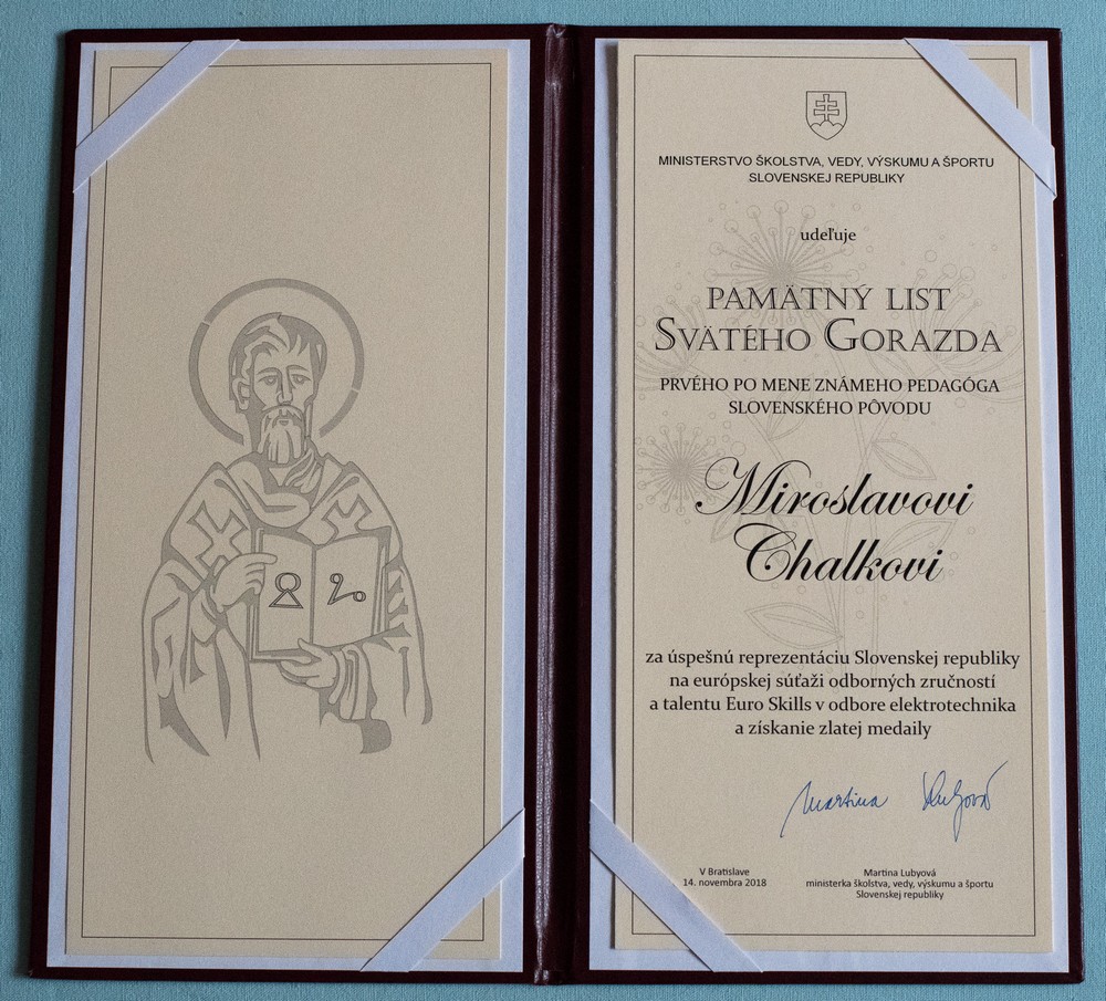 Za úspešnú reprezentáciu Slovenskej republiky na európskej súťaži odborných zručností a talentu EuroSkills, ktorý sa tento rok konal v Budapešti - v odbore elektrotechnika a za obsadenie vynikajúcej zlatej priečky si najvyššie rezortné ocenenie prevzal aj Miroslav Chalko, bývalý študent Strednej odbornej školy v Starej Turej (dnes už poslucháč VUT Brno).