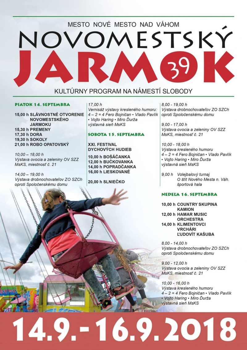 Návštevníci azda najznámejšieho a najväčšieho jarmoku v Trenčianskom kraji každý rok zaplnia ulice v Novom Meste nad Váhom. Na v poradí 39. novomestský jarmok sa verejnosť môže tešiť už počas tohto víkendu. Od piatka 14. septembra sa na Námestí slobody zídu všetci tí, ktorí ctia kultúrne tradície mesta i kraja. K hudobným hosťom, ktorí obohatia priebeh jarmočného programu, patrí napríklad Robo Opatovský či kapela Dora. V rámci rozsiahleho podujatia si na svoje prídu i milovníci dychových hudieb. Festival dychoviek s poradovým číslom 21 bude spestrením sobotného programu novomestského jarmoku. „Novomestský jarmok patrí každoročne k najnavštevovanejším podujatiam v Trenčianskom kraji. Som rád keď sa ľudia môžu prísť zabaviť, oddýchnuť si, najesť sa alebo len tak sa stretnúť a porozprávať sa medzi sebou. Ďakujem mestám, obciam i všetkým, ktorí jarmoky v kraji poctivo pripravujú a obetujú tomu svoj voľný čas. Pevne verím, že obyvatelia si to vážia a že i tento rok si budú môcť povedať, že sa cítili dobre. Je rok Európskeho kultúrneho dedičstva a tým naším sú práve takéto tradičné podujatia,“ uviedol trenčiansky župan Jaroslav Baška.