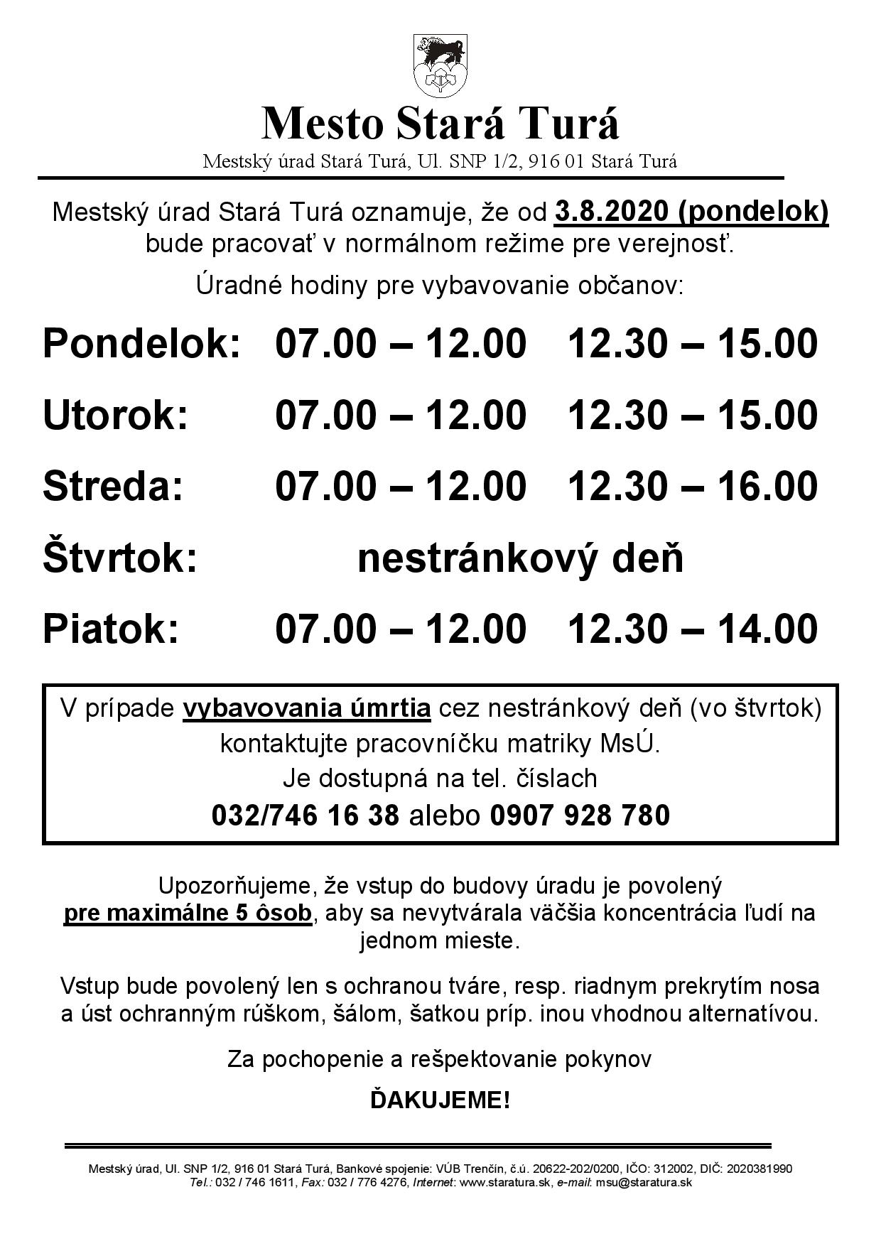 Mesto Stará Turá oznamuje, že Mestský úrad v Starej Turej bude v dňoch 3.11. až 6.11. 2020 pre verejnosť zatvorený. Svoje záležitosti môžete vybavovať prostredníctvom telefonátov alebo emailov na jednotlivé oddelenia. Matričný úrad bude prístupný iba pre vybavovanie úmrtných listov.